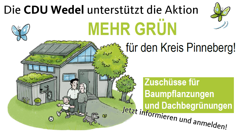 Die CDU setzt sich für die Aktion „mehr Grün für den Kreis Pinneberg“ ein. Bäume und Gründächer haben eine zentrale Bedeutung für das Leben in den Kommunen. Der Kreis möchte alle Bürgerinnen und Bürger durch eine Förderung die Möglichkeit geben dieses Konzept mit zu leben und so einen Beitrag u. a. zum Klimaschutz und der Klimaanpassung zu leisten.